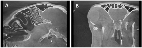 CBCT of 3M-7. Ventilated stent in longitudinal (A) and cross-section (B) of the sheep skull indicated by arrows.