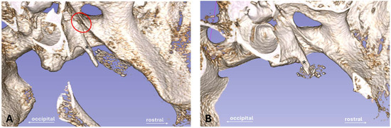 No stent fractures were detected in CBCT. Stent location was visually determined in relation to the individual bony anatomy of the animals based on the Proc. muscularis (Figure 7) and the channel-like bony portion of the ET [40]. All stents were located close or next to the Proc. muscularis and no stent was positioned in the bony ET part, meaning that all 20 stents in the ET were positioned as deep as anatomically possible in the cartilaginous part of the ET. However, these anatomical landmarks varied in shape and length.