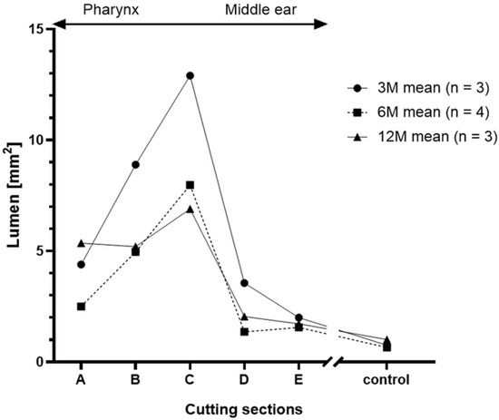 Furthermore, cases with abnormal ME status were also suspicious of increased secretion areas in histology (five out of six cases) compared to the secretion of their corresponding group mean (Table 5); the exception was 12M-7 (Table 6). Group 3M stands out with eight out of eight type A tympanograms, eight out of eight free MEs, the lowest average secretion, and on average the highest lumen in histology.