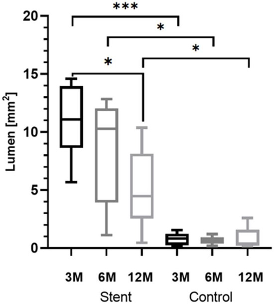 Additionally, the length of the stents was approximated by measuring the distances from X-ray marker to X-ray marker. The values were 13.5 ± 0.5 mm, 13.3 ± 0.2 mm (without the compressed stent 6M-2), and 13.4 ± 0.3 mm for the 3M, 6M, and 12M groups, respectively. No difference in stent length was found between the groups (Kruskal–Wallis test; p = 0.1081).