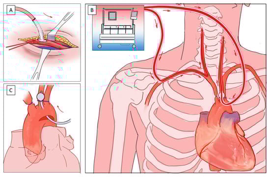 The Vienna approach for perfusion during aortic arch surgery: (A) Cannulation of the right axillary artery via an 8 mm side graft; (B) Bi-hemispheric antegrade cerebral perfusion during circulatory arrest via the right axillary artery (retrograde); and (C) A selectively introduced perfusion catheter in the left carotid artery.