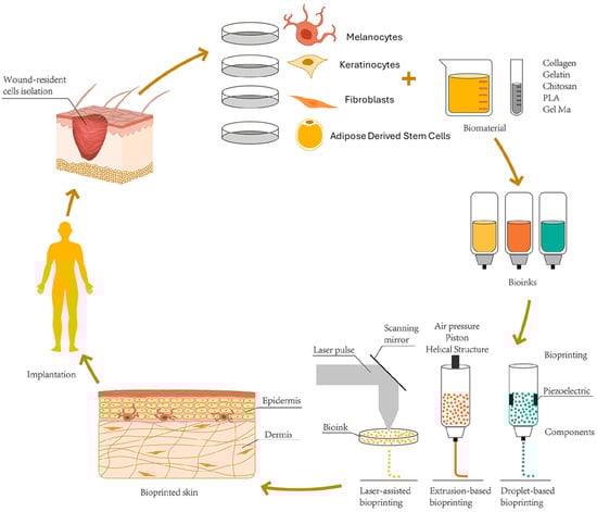 Schematic representation of skin 3D bioprinting. Reprinted (adapted) from Weng et al. [] under the terms of the Creative Commons Attribution—Noncommercial 4.0 License. https://creativecommons.org/licenses/by-nc/4.0/ (accessed on 11 July 2024).