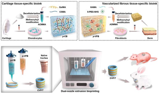 A schematic illustration of instant trachea reconstruction using cartilage- and vascularized fibrous tissue-specific bioinks and 3D-bioprinted cartilage-vascularized fibrous tissue-integrated trachea in mice and in situ trachea reconstruction in rabbits. Abbreviations—ACMMA: methacryloyl-modified acellular cartilage matrix; ADMMA: methacryloyl-modified acellular derm matrix; HAMA: methacrylate-modified hyaluronic acid; 8-PEG-NHS: 8-arm-polyethylene glycol-succinic acid ester; GelMA: gelatin methacryloyl; CSMA: methacrylate-modified chondroitin sulfate; p-CB: photocrosslinkable cartilage-specific bioink; p-VFB: photocrosslinkable vascularized fibrous tissue-specific bioink. Reprinted from Huo et al. [], under the terms of the Creative Commons Attribution—Noncommercial 4.0 License. https://creativecommons.org/licenses/by/4.0/ (accessed on 11 July 2024).