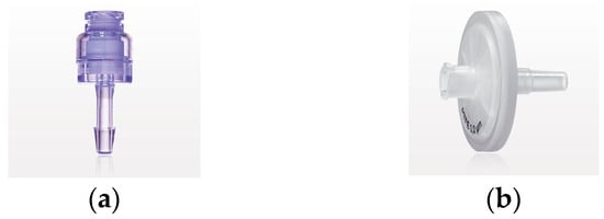 Photographs of the accessories: (a) Swabbable Female connector and (b) Female Luer Lock filter.
