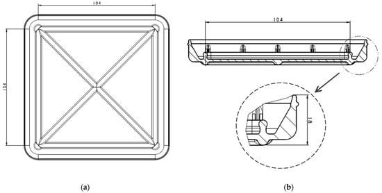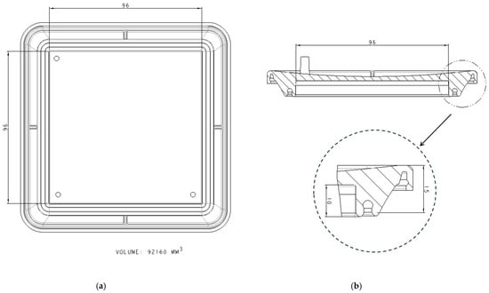 Cover design with dimensions in mm: (a) Bottom view of the cover; (b) section view and enlarged sealing zone.