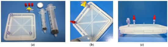 To ensure an airtight environment, a simple leakage test was carried out. After the closure of the bioreactor, a water content of 2.6 times the volume of the bioreactor was introduced in it, applying a pressure of 250 Pa (Figure 5a,b). The idea was to evaluate the pressure that the device can withstand without suffering leakage from the cavity to the surrounding area. In this test, the water did not cross the first sealing zone, so it can be concluded that the device is an effectively sealed system (Figure 5c). The bioreactor can withstand an internal pressure of two and a half times its volume without losing watertightness.