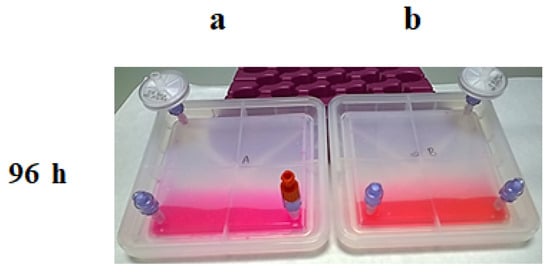 Step 2: Device A was maintained at 37 °C with 5% of CO2, whereas device B was kept at 37 °C in an incubator without CO2 input. Then, 48 h later, samples of both conditions were extracted and analysed to check the pH and the sterility. Media from device A maintained the expected pH; however, the lack of CO2 input in device B turned the pH into an alkaline pH (Figure 6).