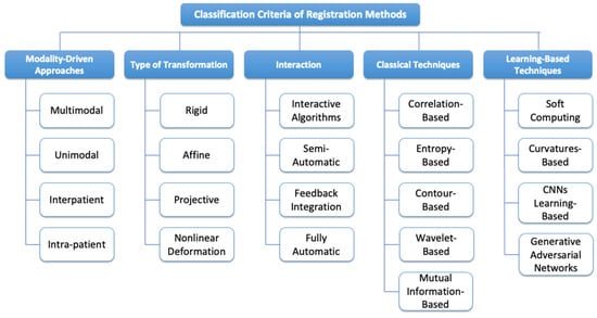 - Curvatures-Based: Another approach in image registration involves curvatures-based methods, which focus on registering a sequence of corresponding points and searching for dimensional projection radiographs. These methods aim to find an optimal fit of the local curvatures in two curves to achieve accurate alignment. This approach is particularly useful in scenarios where the shapes or contours of objects are critical for alignment, such as in medical imaging or object recognition tasks [44].