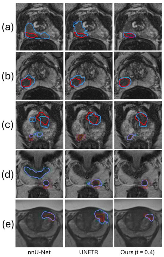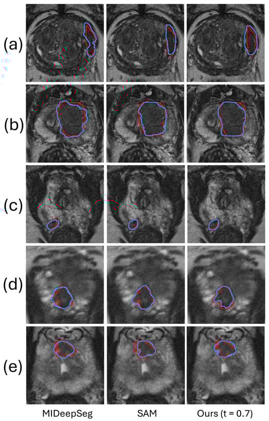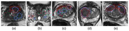 Examples of PCa segmentation results from U-Net []. The red and blue contours represent ground truth and algorithm segmentation, respectively. (a–c) show cases with false positives and false negatives generated by the automated segmentation method, and (d,e) show cases where the automated segmentation method demonstrates superior performance.