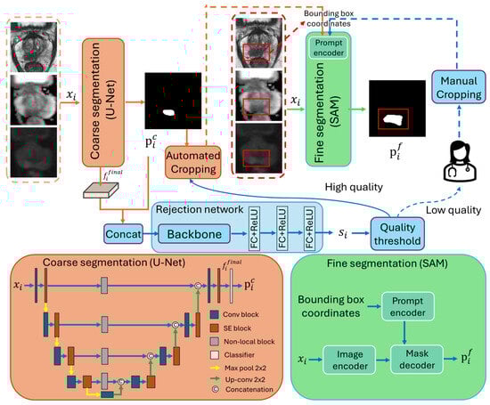The overall workflow of our proposed interactive cascaded network is illustrated in Figure 2, consisting of a coarse segmentation U-Net [], a rejection network, and a SAM [] to generate the final segmentation. Let be an input image block with an axial spatial size of , and the three channels represent the T2W, ADC, and DWIhb image modalities. All entities with the subscript i in the description below are associated with the ith image, and N represents the total number of images. is first fed to the coarse segmentation U-Net, generating the prediction as follows: