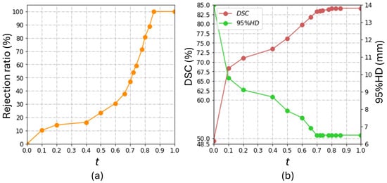 The influence of the burdens of human intervention on the model performance in the Prostate158 dataset. The rejection ratio quantifies the burden of human intervention. (a) shows the correlation between the threshold, t, and the rejection ratio in our study; (b) shows the effect of t on the overall model performance.