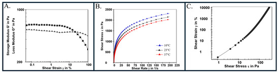 In this work, a two-material hydrogel biomaterial ink was selected composed of alginate and CMC [23,44]. These materials, in combination, are known to have anti-infective properties [44], and both materials are generally regarded as safe by the US Food and Drug Association (FDA) [45]. Alginate/CMC biomaterial ink containing 5.3% alginate (2% low viscosity plus 3.3% high viscosity) and 4% CMC was developed and evaluated for printability using rheology. For rheological testing, an amplitude sweep from 0.05% to 100% strain at 1 Hz was used to determine the viscoelastic properties of the biomaterial ink at 23 °C and to define parameters to guide further rheological testing (Figure 2A). The measured elastic energy storage modulus (G′) value of 625 Pa is greater than the 520 Pa value of the loss (viscous) modulus (G′′), suggesting that the biomaterial ink is printable [46] and behaves like a viscoelastic solid. The linear viscoelastic region (LVE) was detected at shear strains from approximately 0.1% to 1%, where the G′ values are essentially constant and independent of the changing shear, and the relationship between the applied stress and the measured outputs is linear. At shear strains between 10% and 100%, the G′ value decreased and intersected the G′′ values at 20% shear strain, indicating shear-induced breakdown of the biomaterial ink is occurring. The storage and loss moduli are significantly less than a similar hydrogel biomaterial ink that was more extensively crosslinked with higher concentrations of Ca2+ ions prior to analysis and printing [44]. Though increased stiffness associated with pre-crosslinking of the alginate improves print shape fidelity, post-print crosslinking allows for more flexibility in tuning the stiffness, where needs can vary depending on the functionality required.