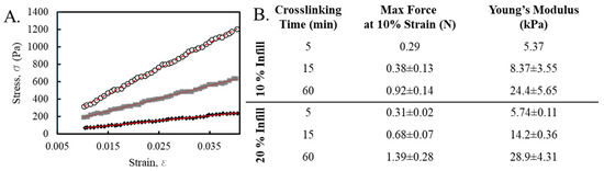 Mechanical testing of the printed bandage dressing squares. (A) Linear portion of example stress–strain curves for samples with 20% infill crosslinked for 5 min, R = 0.99 (Black Diamonds), 15 min, R = 0.99 (Grey Squares) or 60 min, R = 0.99 (Black Circles). The data were fit to linear regression, and the slope of the curve fit is Young’s modulus. (B) Maximum force at 10% strain and Young’s modulus of printed alginate/CMC hydrogel dressings after 5, 15, and 60 min of crosslinking in CaCl2.