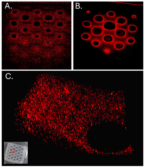 Alginate/CMC bio-ink was mixed with red fluorescently labeled EVs, and the dressing (20 × 20 × 1 mm) was printed as described above and crosslinked with CaCl2 for 15 min (Figure 6). Healing of full-thickness skin wounds in mice improved with the injection of EVs directly into the wound [50]. Based on wound volume calculations, we incorporated a similar concentration of 0.5 µg of lyophilized EVs per µL wound volume. Fluorescent EVs were readily visible in both the non-crosslinked and crosslinked prints (Figure 6A,B), and EV uniform distribution was confirmed throughout the thickness of the hydrogel using confocal microscopy (Figure 6C). Thus, EVs can be combined successfully with the alginate/CMC bio-ink and 3D bioprinted into the shape of a dressing.