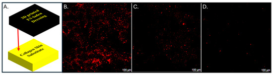 Transfer of EVs from dressing bio-ink to collagen blocks. (A) A 3D-printed collagen block was used to simulate skin to test the transfer of EVs from the printed dressing to the skin. The alginate/CMC dressing was printed using 20% infill, crosslinked, and cut to 10 mm × 10 mm × 3 mm. It was placed on top of a similar-sized collagen block and incubated at 37 °C in a 6-well plate with 1 mL of PBS to keep the collagen hydrated. (B) Positive control: a solution of fluorescently labeled EVs pipetted on top of the collagen and left to absorb. The collagen block was removed at 24 h and imaged for the appearance of labeled EVs transferred from the dressings that were crosslinked for (C) 10 min or (D) 60 min. Microscopy images taken at 20X magnification.