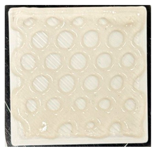 Biomaterial ink was evaluated for rheological properties to determine if the material was printable. Biomaterial ink was extruded into shapes of 20 × 20 × 3 mm structures using a 22-gauge conical tip, a speed of 6 mm/sec, and pressures ranging from 90 to 100 kPa using a commercial research grade bioprinter. The biomaterial ink extruded well, and print shape fidelity was maintained (Figure 3, top). Before crosslinking, the printed objects had the same outer dimensions as the CAD file. The fine detail resolution of the holes within the honeycomb pattern showed that internal print fidelity was not as good as the exterior dimensions. This may be the result of the biomaterial ink viscosity and yield stress and slight over-extrusion of the biomaterial ink, which is difficult to control using pneumatic, non-screw-driven print heads [24]. Following alginate crosslinking with CaCl2 (Figure 3, bottom), the outer dimensions measured 21.6 ± 0.3 mm × 21.7 ± 0.3 mm.