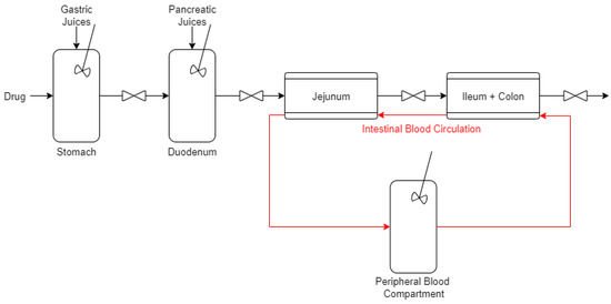 As this model is intended for preliminary assessment, only major drug absorption sites are included. Therefore, Equations (1)–(4) do not include terms related to drug absorption, which mostly occurs in the jejunum and ileum, due to their extensive surface area and prolonged transit time [54,55].