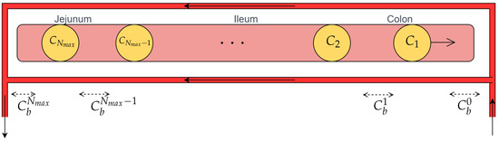 The peripheral blood compartment was, instead, modeled as a continuous stirred tank reactor (CSTR), in which a first-order reaction of drug degradation and consumption occurs. The splanchnic circulation was treated separately, with a countercurrent flow crossing both the ileum–colon and jejunum. Moreover, it was assumed that there was no segregation of the gut blood flow. As a result, Equations (13)–(15) were obtained: