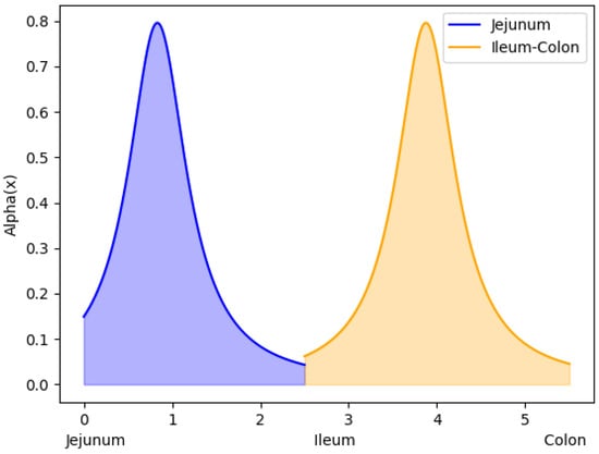 Example of alpha function distribution along the intestinal tract. It can be observed that the tail of the ileum–colon distribution falls on the colon, explicitly expressing the low absorption present in this segment.