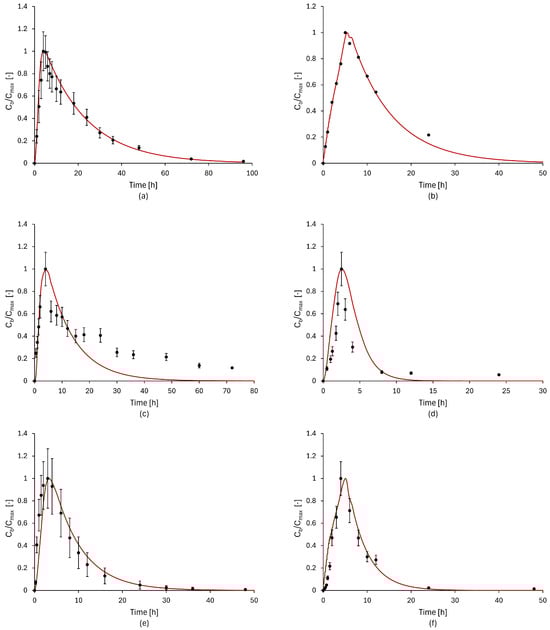 In consideration of the aforementioned approximations and the limited number of parameters and simplicity of the equations describing absorption, the model predictions are a satisfactory result. The estimated curves demonstrated an adequate capacity for describing the concentration profile of the drugs considered in this study, particularly in the prediction of the time of maximum concentration. However, more substantial errors were observed in the concentration decay. This discrepancy may be attributed to the selection of the optimization algorithm, namely, ordinary least squares, which assigns greater weight to high values, which have a higher standard deviation. Consequently, the selected optimization method prioritizes the identification of the peak concentration time point. Clearly, the algorithm may undergo variations depending on the subsequent analyses to be performed.
