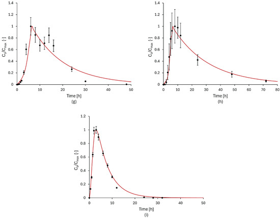 Comparison between model simulation results (red line) and experimental data (black dots) for nine different drugs: (a) Aprepitant (80 mg) [56], (b) Griseofulvin (125 mg) [57], (c) Etoricoxib [64], (d) Ketoprofen [63], (e) Linezolid [58], (f) Danazol [59], (g) Ibuprofen [61], (h) Fenofibrate [60], and (i) Ketokenazole (600 mg) [62]. Both the model and experimental concentrations were normalized with respect to their highest values.