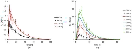 Results of the validation process for different dosages of Aprepitant [56] (a) and Ketokenazole [62] (b). The continuous lines indicate the predicted curves, while the individual points correspond to the experimental data.