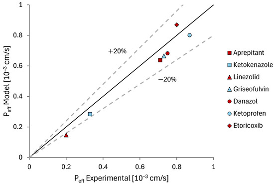 Furthermore, additional validation was conducted by comparing the experimental effective intestinal permeability values with those provided by the model, which were calculated according to Equation (22):
