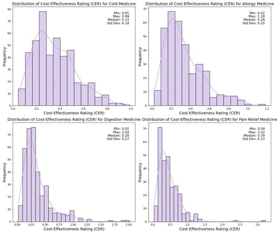 To build appropriate machine learning models to identify factors impacting the cost-effectiveness rating of each medicine item, we conducted data preprocessing. Initially, we removed items lacking ratings or prices, as we could not derive the CER for them. This procedure resulted in a reduction of the dataset by 176 records. Additionally, to ensure the robustness of the derived CERs, we eliminated medicine items with fewer than 100 reviews, further reducing our dataset to 1445 records. Upon analyzing the distribution of CERs for each medicine type, we observed that the dataset exhibited right skewness, with some extreme CER values on the right end, as depicted in Figure 2.