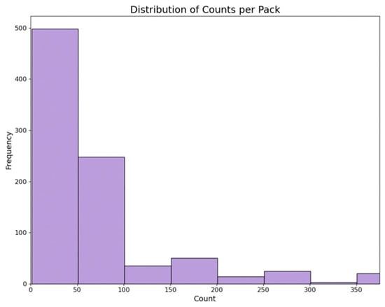 Under this category, we considered three metrics to gauge the size perspective of each item: counts per pack, weight (in ounces), and dimensions (in inches). Each metric was divided into four quantiles (e.g., 1st quantile as the ‘highest quantile’ for size, 2nd quantile as the ‘high quantile’, 3rd as the ‘low quantile’, and 4th as the ‘lowest quantile’). Then, one-hot encoding was utilized to create dummy variables for each quantile. Figure 4 displays the distribution of counts per pack from all collected medicines.