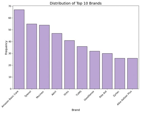 The label refers to the brand of the item. We counted the frequency of each brand by medicine type, and then, converted major brands into binary columns using one-hot encoding. Figure 5 shows the distribution of the top 10 brands across all collected medicines.