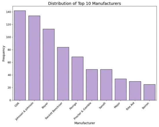Similar to the brand feature, we counted the frequency of each manufacturer by medicine type and created individual binary columns for major manufacturers using one-hot encoding. Figure 6 displays the distribution of the top 10 brands among all collected medicines.