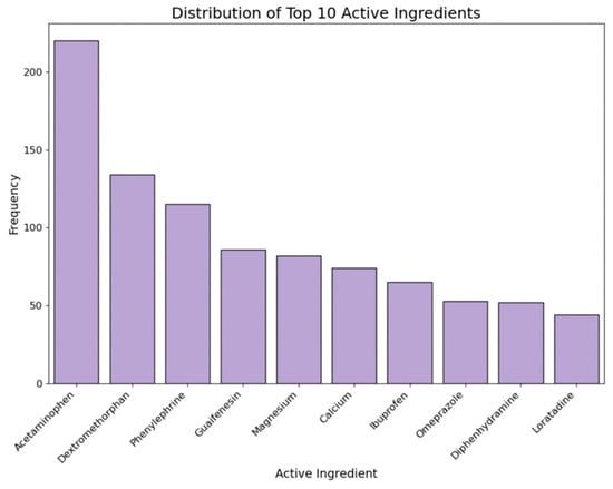 This label includes the item’s active ingredients. By counting the frequency of each active ingredient by medicine type, we converted the major active ingredients into binary columns using one-hot encoding. Figure 7 demonstrates the distribution of the top 10 ingredients across all collected medicines.