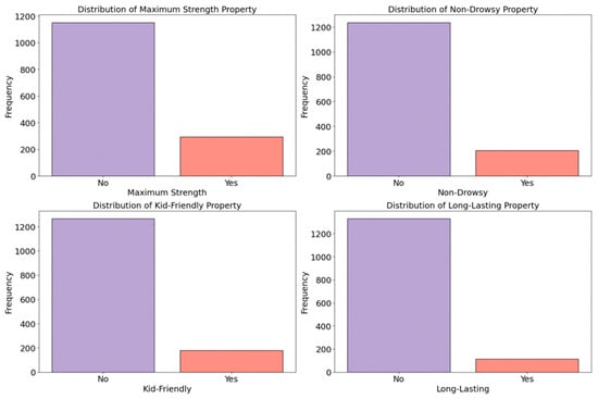 These features indicate whether the medicine item possesses specific properties such as being fast-acting, long-lasting, maximum strength, non-drowsy, and/or kid-friendly. From columns including ‘Product Name,’ ‘Special Feature,’ ‘About,’ and ‘Item Description,’ we identified keywords reflecting each special effect. Figure 8 illustrates the distribution of maximum strength, non-drowsy, kid-friendly, and long-lasting special effects among all the collected medicine items.