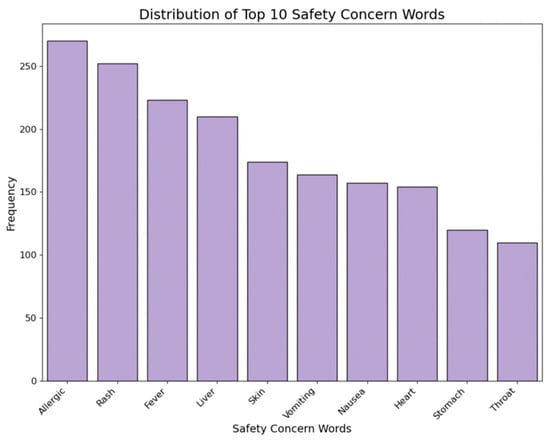 Safety warnings indicate the number of safety concern words associated with each medicine item. Major safety concerns were identified from the ‘Safety Information’ column by counting their frequencies. A variable was created to count each medicine item’s number of major safety concern words. Figure 10 showcases the distribution of the top 10 safety concern words among all the collected medicine items.