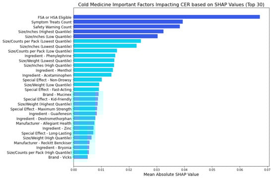 In Figure 15, we examined the directional impact of key factors for cold medicine. Both ‘FSA or HSA eligible’ and ‘symptom treats count’ showed positive impacts, indicating that medicines eligible for pre-tax funds and those treating more symptoms tend to be more cost-effective typically. Surprisingly, ‘safety warning count’ also positively influenced the CER, suggesting that medicines with safety warnings might offer better cost-effectiveness than those without. When comparing medication with and without safety warnings, we found that those with warnings not only had a lower average price (USD 12.95 vs. USD 19.08) but also received higher average ratings (4.68 vs. 4.57). Further analysis revealed that medicines with safety warnings more frequently contained active ingredients such as dextromethorphan, acetaminophen, and phenylephrine (as shown in Table 7), clinically proven to be effective in treating cold symptoms [41,42,43].