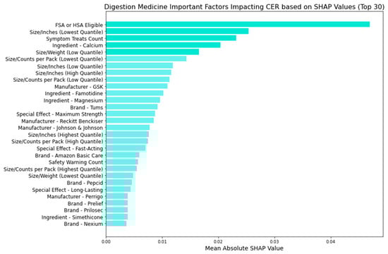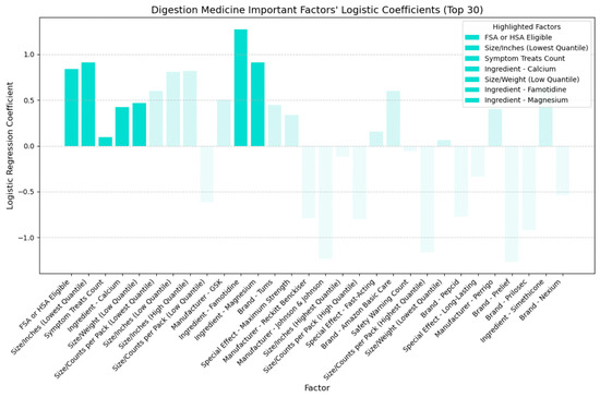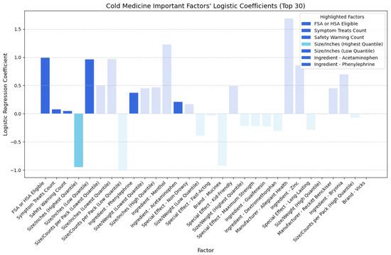 We determined the magnitude of each factor’s impact by analyzing mean absolute SHAP values. In addition, we developed logistic regression models to investigate the direction of impact (positive or negative coefficients) for each factor concerning each medicine type. While SHAP values can also provide insights into the direction of impact, logistic regression offers a straightforward and intuitive interpretation [35,40]. A positive coefficient for a particular factor indicates that an increase in the feature value leads to a higher likelihood of the positive class, thus being more cost-effective. Conversely, a negative coefficient suggests that an increase in the feature value corresponds to a lower likelihood of the positive class of CER. The direct relationship between the sign of the coefficient and the prediction outcome facilitates a straightforward interpretation of the directional impact of factors on the cost-effectiveness rating. Moreover, compared to SHAP, logistic regression coefficients offer a more straightforward approach for customers to grasp the directional influence of factors, aiding in making more cost-effective purchasing decisions.