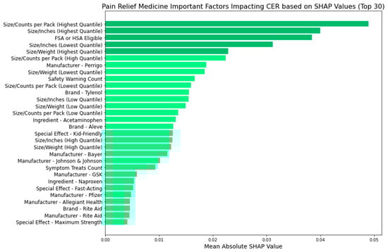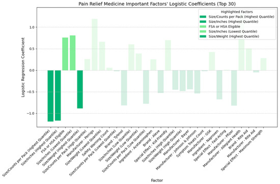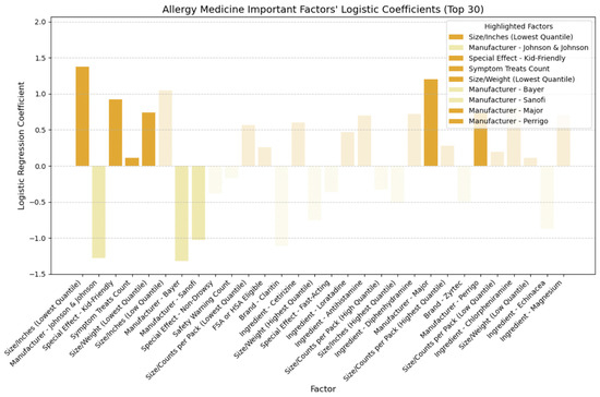 In Figure 16, we delved into allergy medicine and uncovered insights into the directional impact of key factors. We found that factors like smaller-sized packaging and lighter weight held positive coefficients, confirming their role in improving cost-effectiveness. Moreover, their positive coefficient indicated that allergy medications featuring kid-friendly special effects demonstrated heightened cost-effectiveness. Similar to cold medicine, allergy remedies addressing a broader array of allergy symptoms generally received higher ratings at comparable prices, thus bolstering cost-effectiveness. When scrutinizing manufacturers, we observed negative coefficients for Johnson & Johnson, Bayer, and Sanofi, while Major and Perrigo exhibited positive coefficients. However, as Table 8 shows, a closer examination of these manufacturers’ average price, rating, and cost-effectiveness ratings (CERs) revealed conflicting outcomes. Despite Perrigo and Major achieving slightly higher ratings, their elevated average prices outweighed the benefits, resulting in lower average CER values, indicating reduced cost-effectiveness. It is possible that interactions between the manufacturer and other feature categories, such as brand, ingredients, and safety warnings, may have influenced the cost-effectiveness ratings, thus altering interpretations of the manufacturer’s logistic coefficient [44,45]. Consequently, relying on manufacturer-based decisions needs more robustness in guiding consumers toward cost-effective allergy medicine purchases. Therefore, in assessing allergy medicine, we primarily focused on other key feature categories identified for the CER, particularly size metrics such as smaller size or lighter weight, special effects, especially those appealing to children; and symptom coverage, particularly medicines capable of addressing a broader range of symptoms.