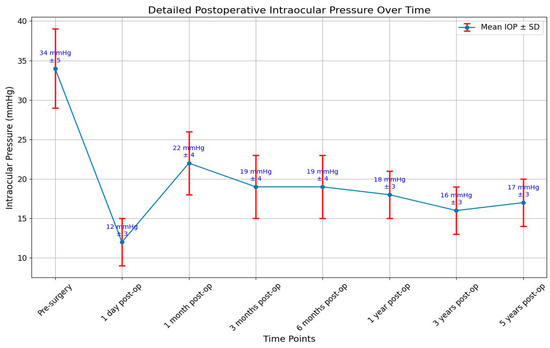 The wide range of IOP values (5–30 mmHg) underscores the need for individualized patient monitoring and management. The mean difference in IOP before and after surgery was found to be 7.53 mmHg. This indicates a statistically significant reduction in IOP post-surgery, supporting the effectiveness of the surgical technique employed. While some patients maintained IOP within the target range, others experienced either hypotonic or elevated pressures, highlighting the variability in postoperative outcomes. The skewed distribution towards higher IOP values suggests that a significant portion of measurements were at or above the target upper limit, which may indicate a need for more aggressive IOP management in some cases. The presence of both hypotonic and elevated pressures in the dataset emphasizes the importance of regular follow-up and potentially adjusting treatment strategies to achieve optimal IOP control (Figure 2).