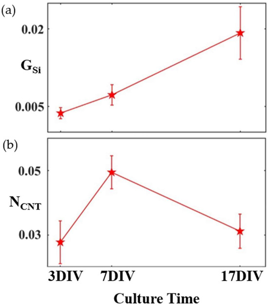 Time evolution of (a) GSi and (b) NCNT for electrodes made of rows of VACNTs separated by smooth areas of SiO2 averaged at three culture times [52]. The glial cells follow a gradual increase in surface coverage across the culture time, while the neuronal processes show a peak at 7 DIV. Error bars correspond to 95% confidence intervals.