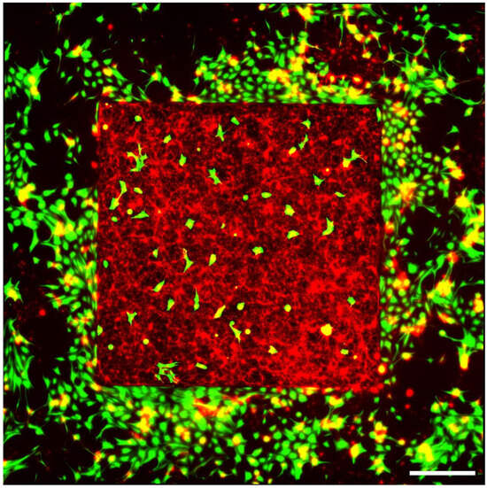 Fluorescence image of retinal cells interacting with a square VACNT electrode (with a side length of 2.145 mm) grown on a SiO2 substrate measured at 17 DIV (green = GFAP labeled glia; red = β-tubulin III labeled neurons). Scale bar corresponds to 500 μm.