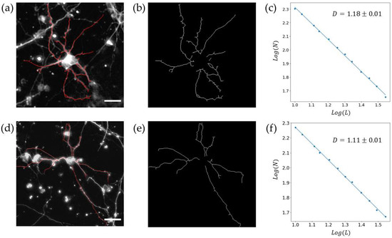 Fractal analysis of the individual neurons for 7 DIV (top row) and 17 DIV (bottom row). (a,d) Representative fluorescence images of β-Tubulin III labeled neurons superimposed on the manually extracted arbors (red); (b,e) the extracted arbors shown separately; (c,f) scaling plots generated when the box-counting algorithm is applied to the two arbor patterns shown in (b,d). The white size bars in (a,d) correspond to a distance of 25 μm.