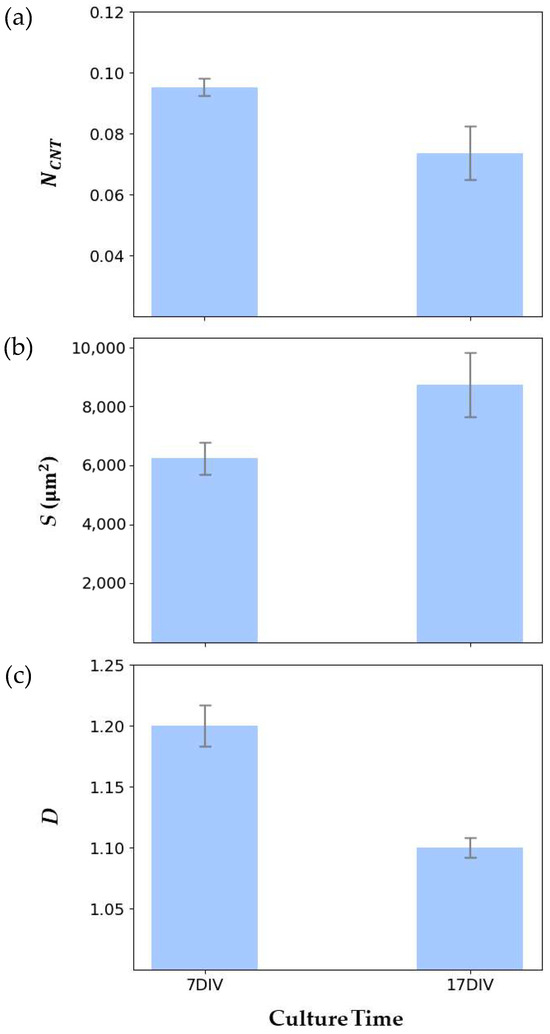 Quantitative analysis of the evolution of neuron characteristics measured from 7 DIV to 17 DIV for (a) NCNT, (b) S, and (c) D. In each case, the error bars correspond to standard error of the mean.