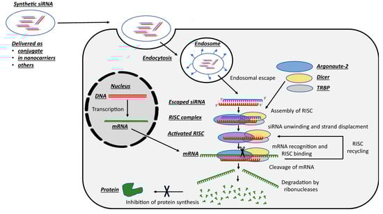 To overcome treatment difficulties, effective targeting of proliferation, cell cycle, angiogenesis and tumor microenvironment, invasion and metastasis, chemoresistance, and enhancing therapeutic performance utilizing siRNA-conjugated nanomaterials and nanobiomaterials in cancer therapy is required. In siRNA-based RNA interference, the oligonucleotides are loaded into nanocarriers before internalization by target cells. When internalized into the target cells, siRNA undergoes endosomal escape before entering the RNAi machinery. After the endosomal escape, the oligonucleotides are merged into the RNA-induced silencing complex (RISC), where they are paired with a target mRNA strand for translational repression or specific gene silencing (Figure 3) [,].