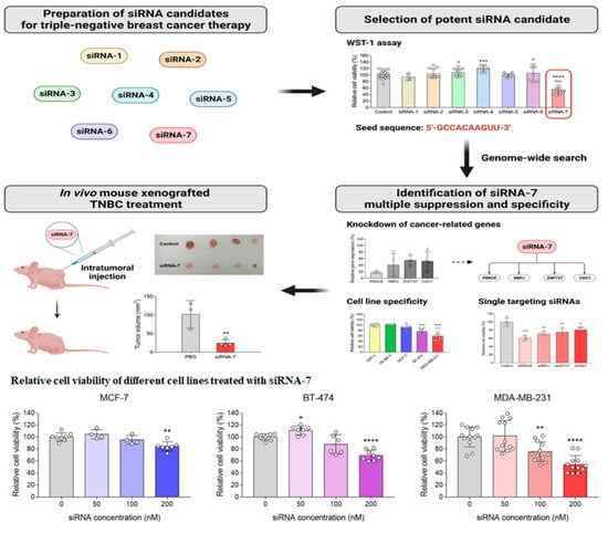 siRNA therapies in TNBC have the advantage of silencing multiple genes, inhibiting tumors, and reducing drug resistance []. Several siRNA candidates (siRNA1-7) were tested against the TNBC MDA-MB-231 cell line. In the study, siRNA 7 was identified as a potential candidate to reduce TNBC tumors in mouse xenografted model silencing multiple genes, PRKCE, RBPJ, ZNF8737, and CDC7 in the TNBC MDA-MB-231 cell line []. The target genes in MDA-MB-231 were identified with the genome-wide search of seed sequences. siRNA 7 demonstrated a significant reduction in cell viability in BT 474 and MDA-MB-231 compared to MCF-7 cell lines (Figure 5). This study indicated the silencing of multiple genes by targeted delivery of siRNA specifically in TNBC cells [].
