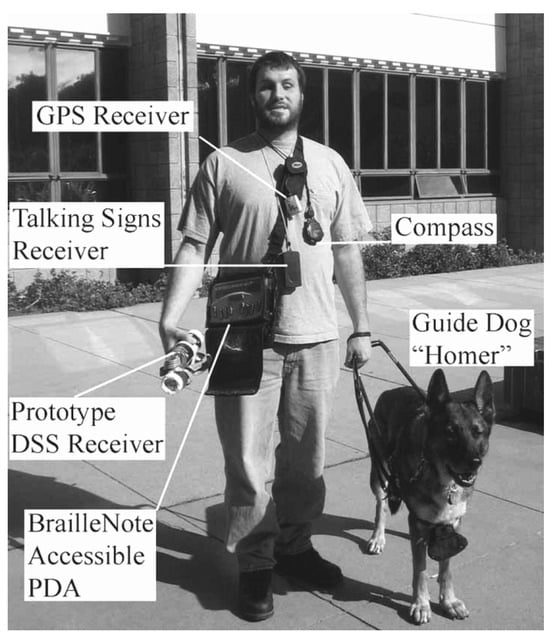 An example of a PVI making use of various assistive technologies [50]. “A blind pedestrian is using a guide dog and five technologies for navigation. This figure illustrates the need for an integrated navigational system. The guide dog aids with mobility and obstacle avoidance. The compass provides the user with heading information when stationary. The GPS [Global Positioning System] receiver integrates with a GIS [Geographic Information System] database (digital map) to provide position and heading information during outdoor navigation. The talking signs receiver gives orientation cues by identifying the direction and location of important landmarks in the environment. The digital sign system (DSS) receiver picks up barcodes from signs and sends them to a database to facilitate indoor navigation. The BrailleNote accessible computer represents the ‘brain’ of the system, allowing Braille input and speech and Braille output. In theory this device could serve as the hub to which all other technologies interface”.