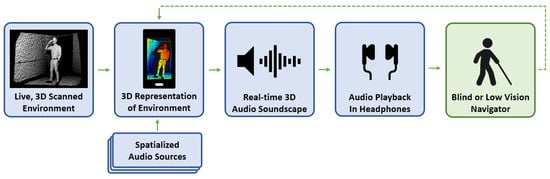 Inspired by echolocators who can navigate by making and interpreting the reverberations of short “clicking” sounds [14], this work describes a novel assistive application platform to leverage modern 3D scanning technology on a mobile device to digitally construct a 3D map of a user’s surroundings as they move about a space. Within the digital 3D scan of the world, spatialized audio signals are placed to provide the navigator with a real-time 3D stereo audio “soundscape”. As the user moves about the world, the soundscape is continuously updated and played back within the navigator’s headphones to provide contextual information about the proximity of walls, floors, people, and other features or obstacles. This approach is illustrated in Figure 2.