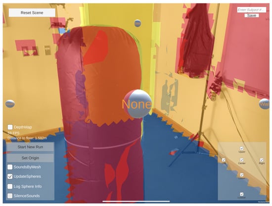 A capture of EchoSee in its current operational state is presented as Figure 5. The capture scene contains an inflatable column (i.e., a punching bag) in the foreground and a door in the corner of the room in the background. The color texturing corresponds to the class that is assigned to the surface by ARKit [56], the visible classes are: “wall” in beige, “floor” in blue, “door” in yellow, and “other” in red. Four of the six audio sources currently used by EchoSee (center, upper, left, and right) are visible in this frame as spheres, the remaining two lower sources are outside of the field of view. The spatialization produced by the raycasting described above is apparent in the differing sizes of the spheres representing the audio sources. The most evident size difference is between the center and upper spheres. The center sphere is much closer to the capture device, shown by its much larger relative size, meaning the audio signal from the center source is playing much more loudly than those of the other sources. This louder audio signal is what would communicate to PVI the presence of a nearby obstacle in the middle of the scene. In contrast, the other sources (especially the upper one) would have quieter audio outputs indicating the increased distance to potential hazards. Together with the constructed mesh of the environment (represented by the colors overlaying the scene) and the spatialized audio sources (represented by the spheres), several interface panels are also visible in Figure 5. These panels are primarily for developmental and study use and include controls for turning on and off each of the sources (the checkboxes in the bottom right of the frame), changing system parameters such as whether to record session data, whether to play the soundscape, whether to display the raw depth map from the LiDAR sensor, etc. (visible in the bottom left). Furthermore, notable is the “Distance to floor: 1.592 m” visible at the center left of the frame, which corresponds to the top of the inflatable column whose height is 1.6 m. The elements at the upper corners of the application allow the operator to refresh the mapping of the environment (“Reset Scene” in upper left) and change the file identifier for the logging of tracking information (text box in upper right).