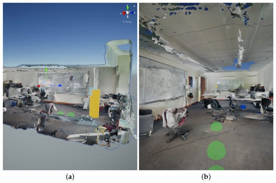 Example use of EchoSee within a digitized, real-world environment. Created using photogrammetry, the scene model was imported into the Unity game engine, permitting the EchoSee application to interact with the virtualized geometry and create audio soundscapes using raycasting. (a) Viewed from an external perspective, a user is represented by a yellow cylinder, also visible is the coordinate system of the virtual environment and two raycast audio sources represented as green spheres. (b) The virtual environment viewed from the user’s perspective, visible in the center of the image (on the back wall of the room) is a yellow point representing the focus point of the capture device, while, visible to the bottom of the image are three green spheres which represent the spatialized audio sources arranged in a preliminary configuration.