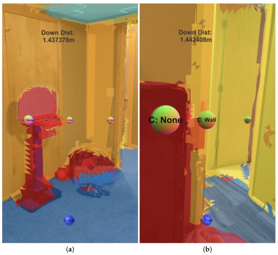Example real-time use of EchoSee within a real-world environment produced by an early development prototype. The reconstructed 3D scene is represented with color overlays, coded according to their classification. The spatial audio sources are visualized with spheres and text labels corresponding to the surface with which they are interacting. (a) Medium range view of a reconstruction from a residential environment, four spheres are visible, three across the center of the image, themselves textured with a normal map, and a single sphere on the floor, colored blue. The current distance to the room’s floor from the device is labeled as ‘Down Dist’ and is approximately 1.44 m. (b) Close range view of a scene, where the virtual spheres’ size across the middle of the image change with their proximity to the device (farther being smaller and vice versa).