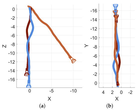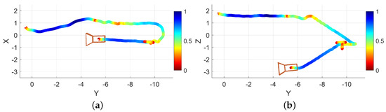 Trace of the example stairwell operation viewed (a) as if looking down on the stairwell from above and (b) as if standing to one side of the stairwell. The color coding of the trace indicates the normalized traversal speed at that point, red being slower, blue being faster. Units are in meters.